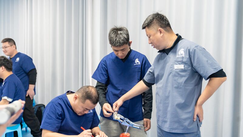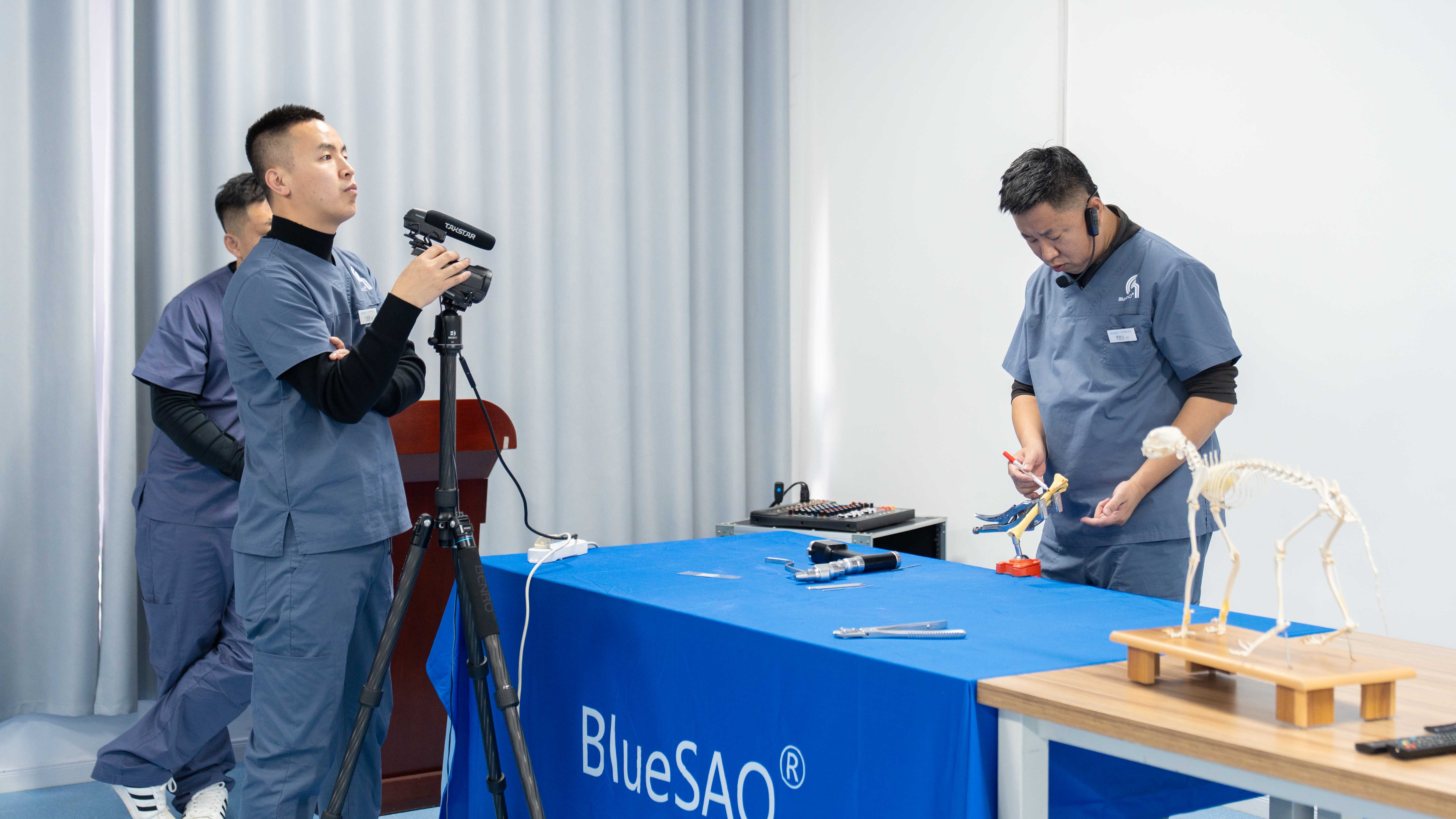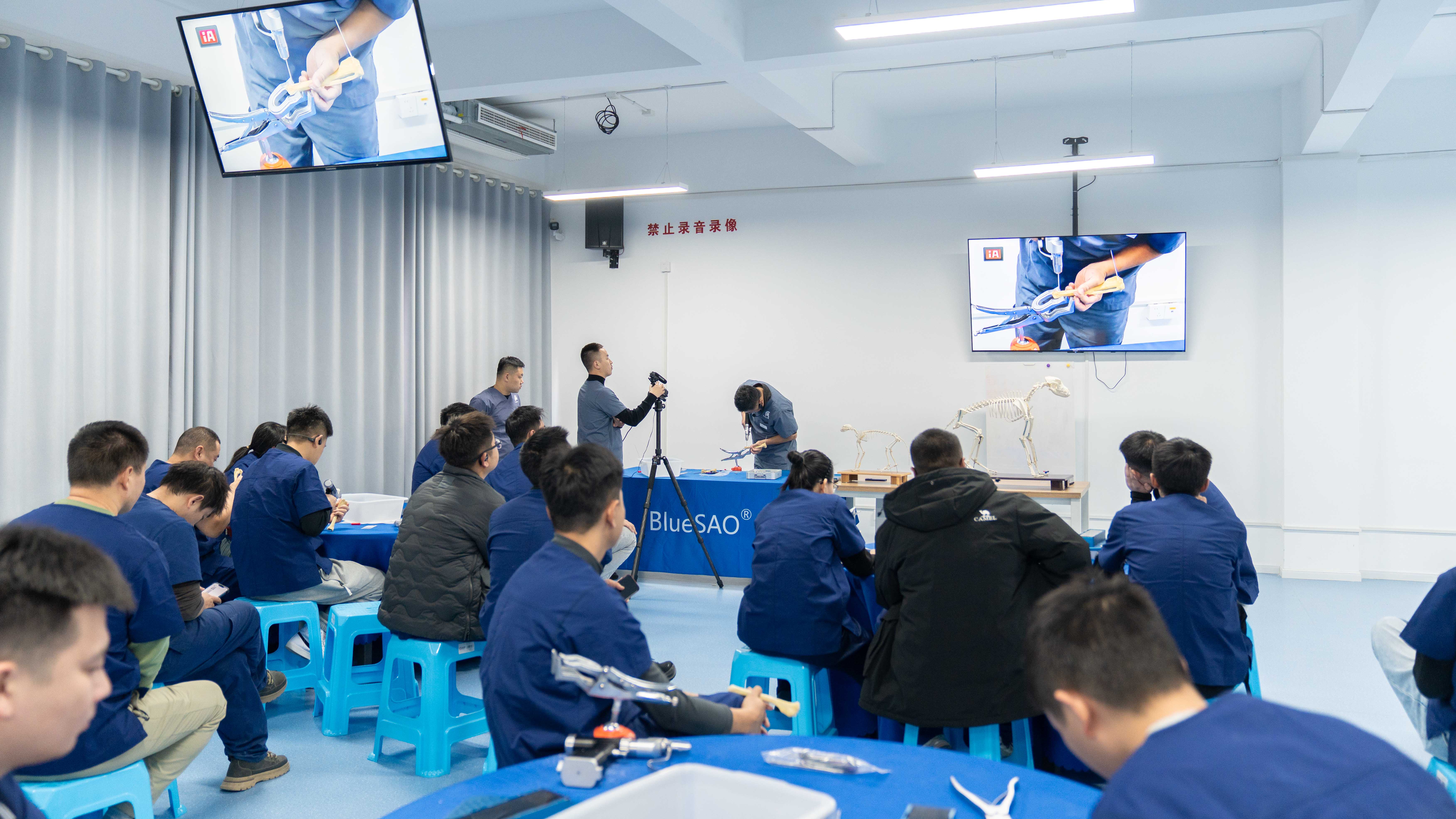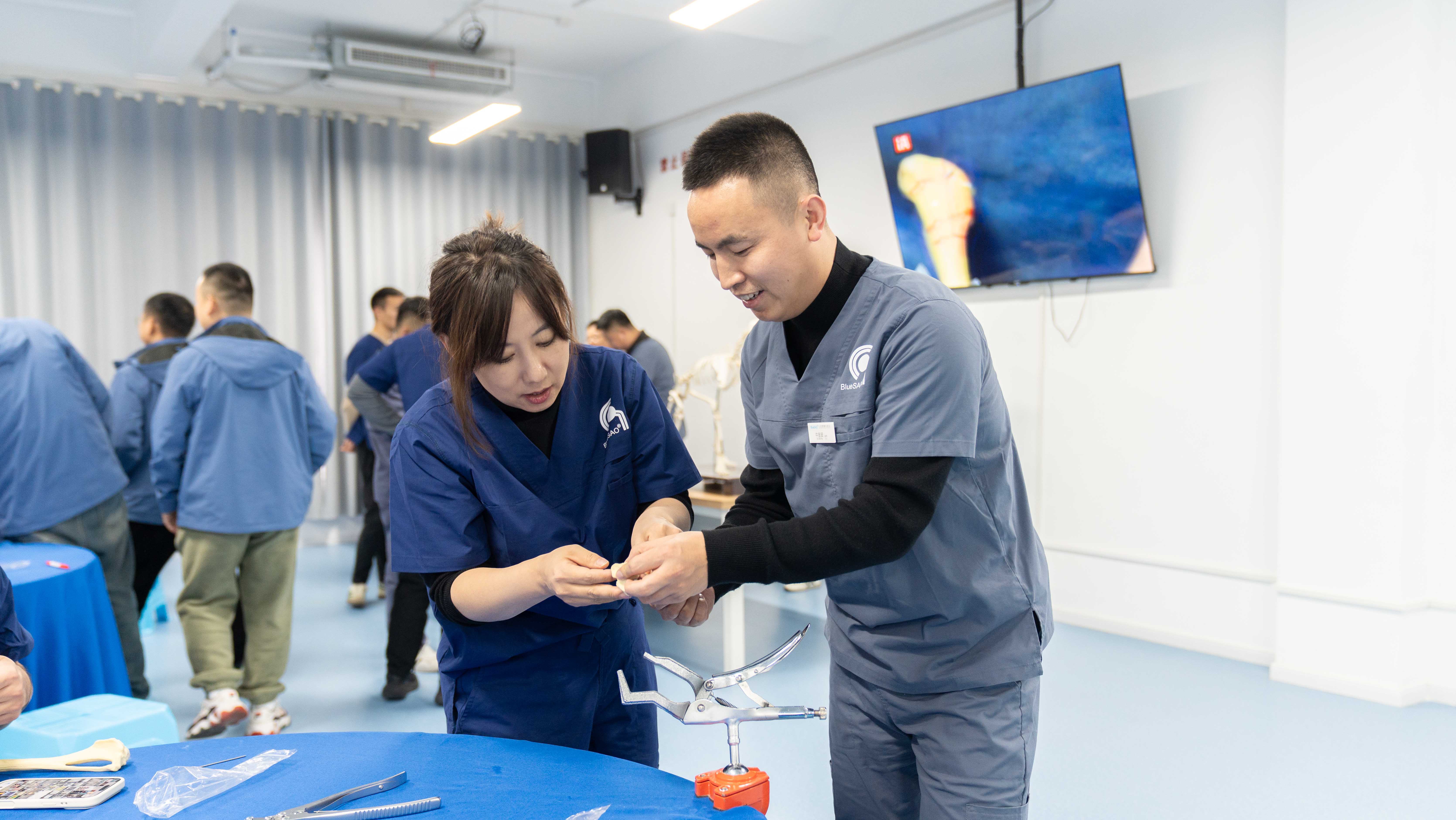 针对小动物膝关节严重病变,滑车沟置换术(PGR)是一项卓有成效的临床解决方案。在牛金波老师的带领下,本次培训迎来备受瞩目的核心实操环节——BlueSAO佰陆全球首发、自主研发的压配式生物型滑车沟置换系统(PGR)实操练习。依托佰陆创新设计的专业化手术器械,再搭配三位资深兽医骨科专家的全程一对一精准教学,每位参会医生不仅迅速吃透手术操作的核心要领,更在标准化的流程指引下,顺利完成从理论认知到实操技能的高效跨越。这场沉浸式实操,为医生们今后开展相关精准诊疗工作,积累了扎实且宝贵的实战经验。