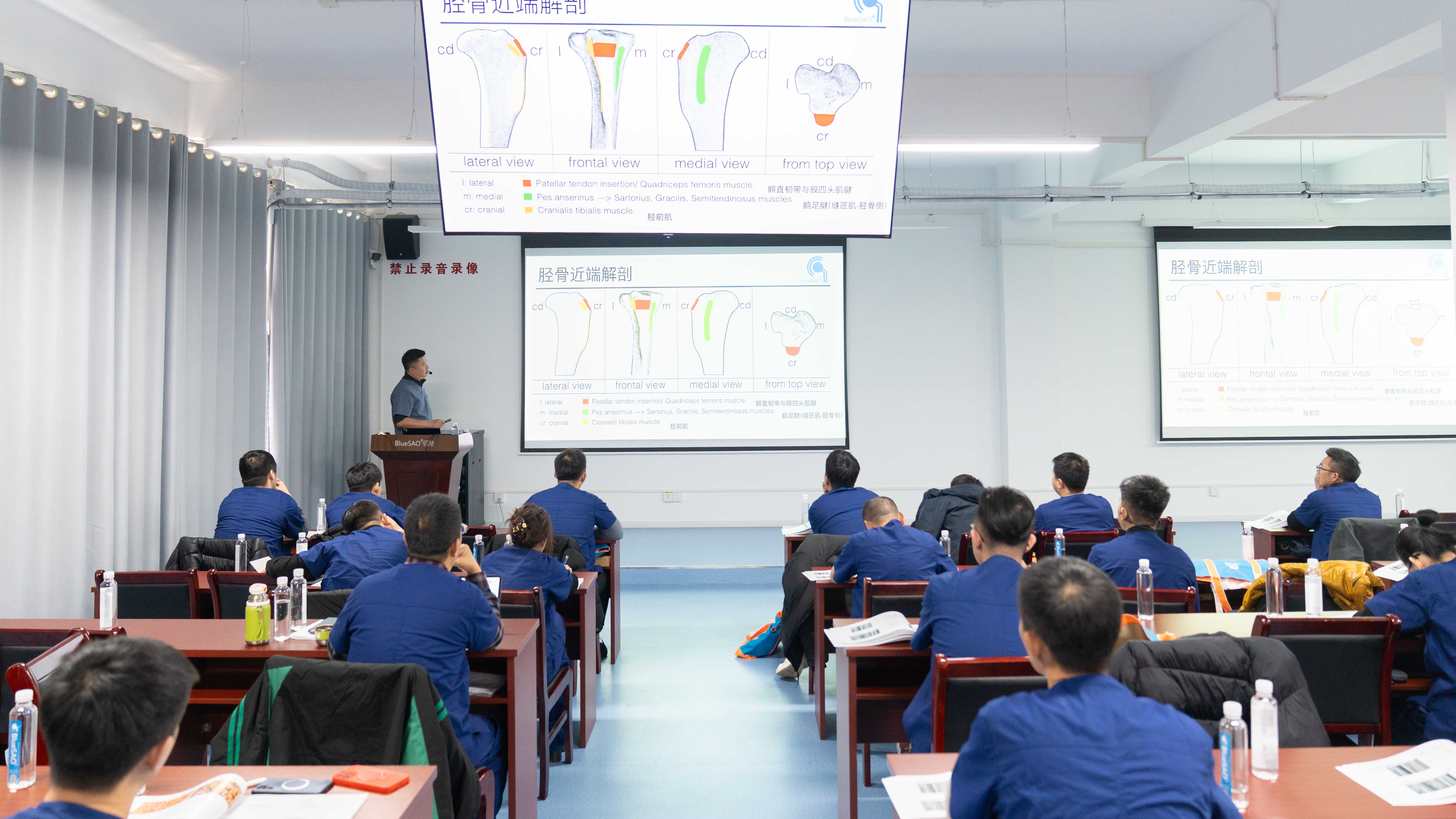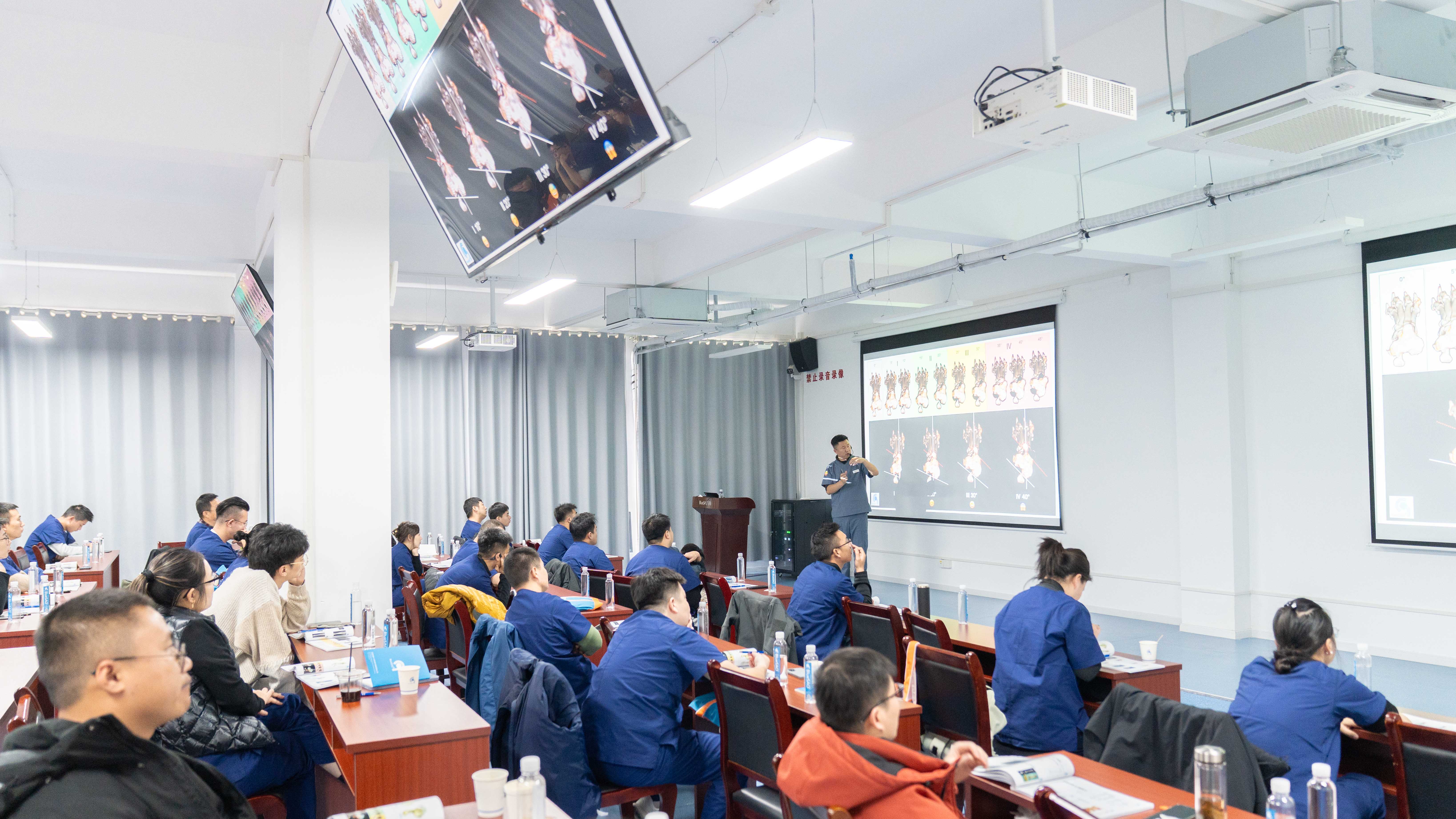 夯实理论根基后,贾新生老师正式开始讲解“胫骨粗隆移位手术”课程。理论授课环节,贾老师依托深厚的小动物骨科专业积淀,以临床诊断要点为切入,结合丰富详实的病例资料,层层深入解析手术关键细节与技术难点,让参训兽医对手术全流程有了清晰透彻的认知。紧随理论讲解的模型实操阶段,贾新生、牛金波、孙康三位资深导师全程跟进,为参训医生提供一对一精准指导与答疑,及时纠正实操误区。在佰陆讲师团的帮助下,所有参训医生均顺利完成模拟手术操作,真正实现了从理论知识到临床实践能力的高效转化。