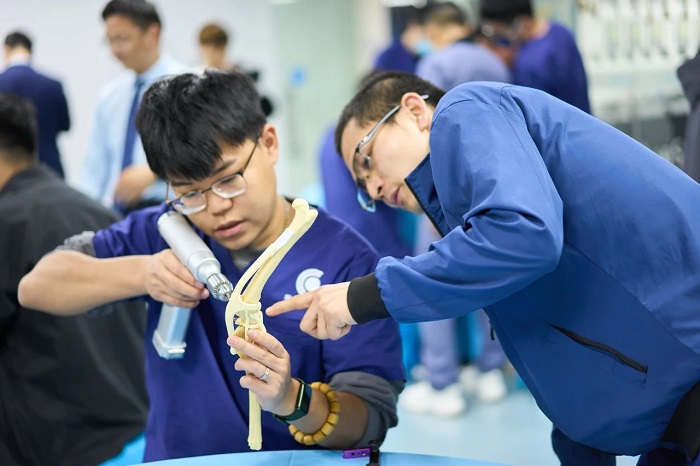 理论课之后紧接着是模型实操,高仿真膝关节实操骨模型人手一个,严格保证实操教学质量;