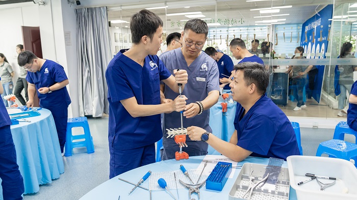 课程继续,吴俊杰老师给大家介绍了椎弓根钉系统和这套系统的操作技巧,理论结束后就是实操。