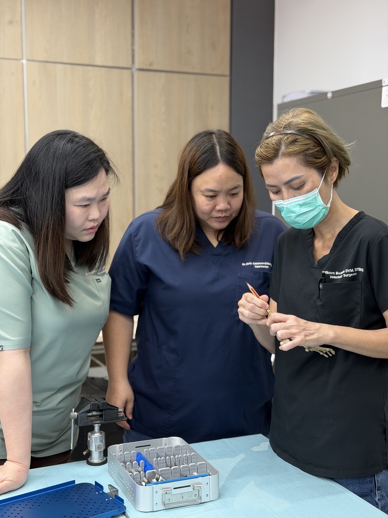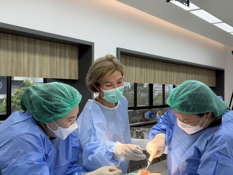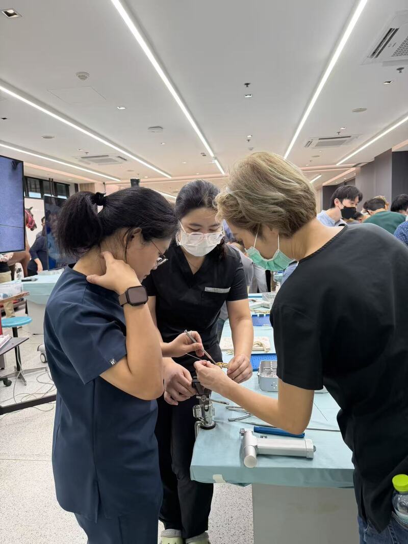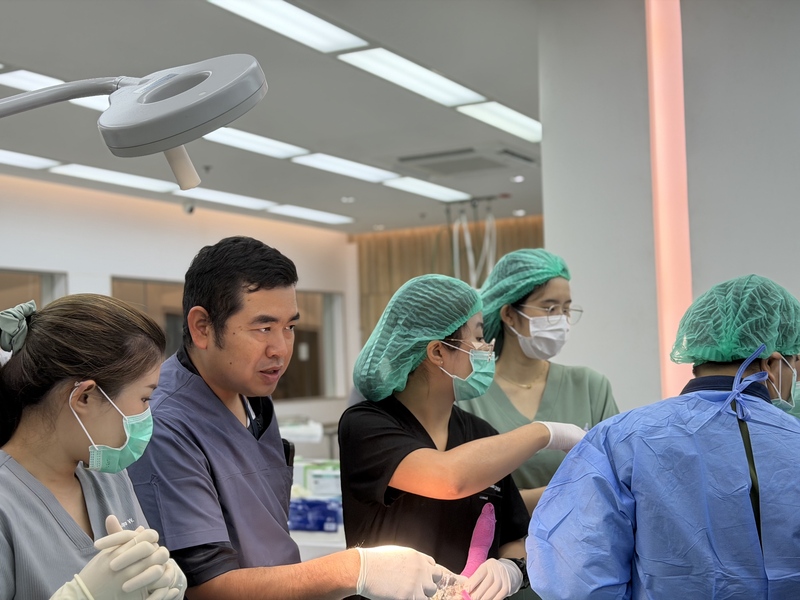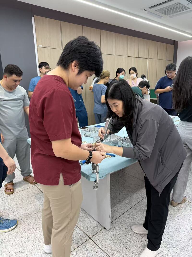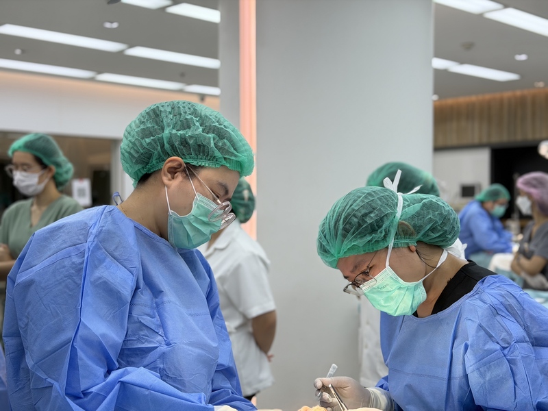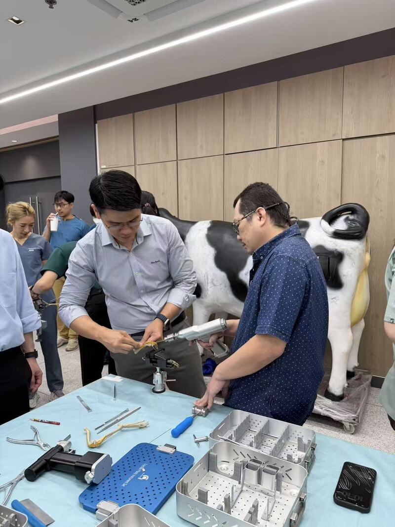 演示环节结束后,参会兽医迅速分组投入实操,全程热情饱满、专注细节,珍惜技能精进机会。Dr. Chaiyakorn Thitiyanaporn与Dr. Sirun Tuekum两位讲师全程关注,精准点拨实操难点、耐心纠正操作偏差,使每一位参训的医生熟练掌握实操要点、提升手术技能。