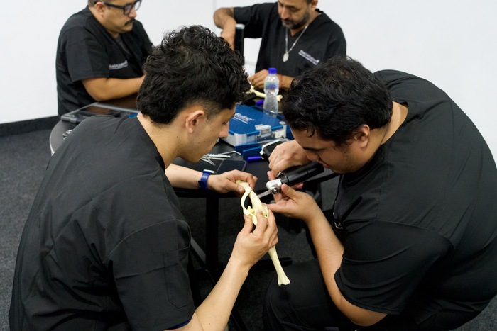 午餐过后,稍事休息,下午的第一节课便是骨模型实操课程(dry-lab)。由秘鲁讲师Dr.Giuseppe进行胫骨畸形矫正的教学演示,然后进行分组实操,所有参会医生均严格按照手术步骤认真实操!