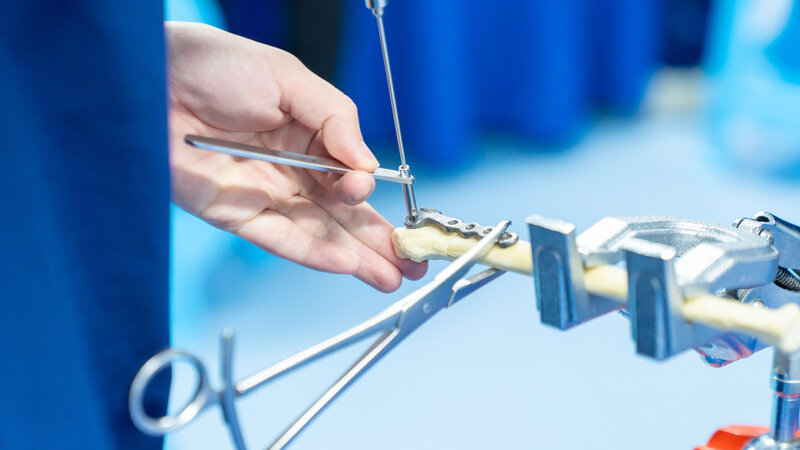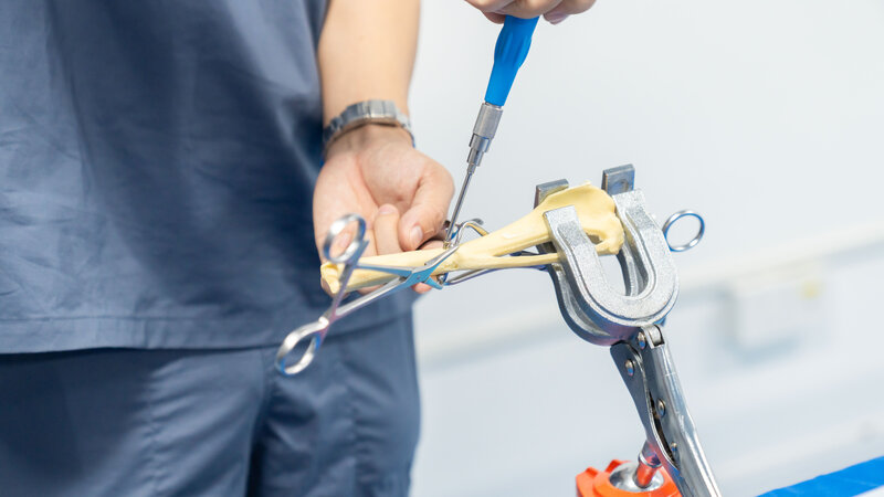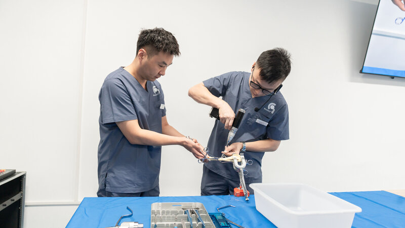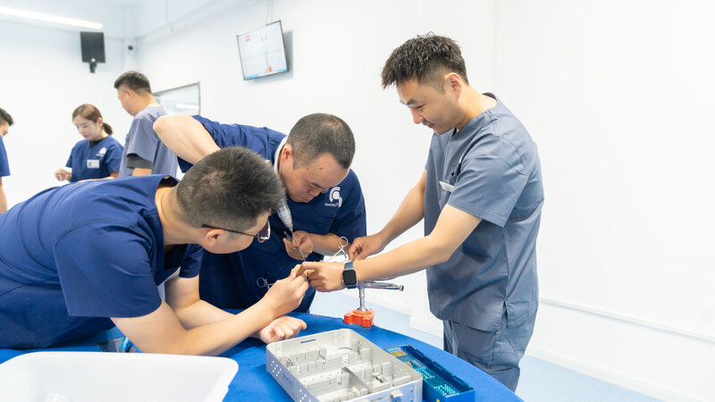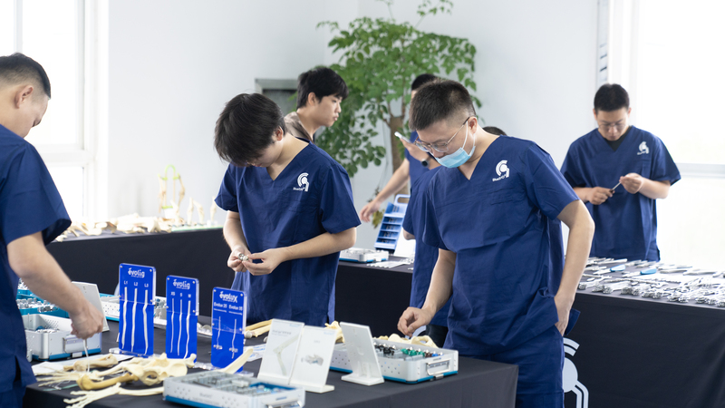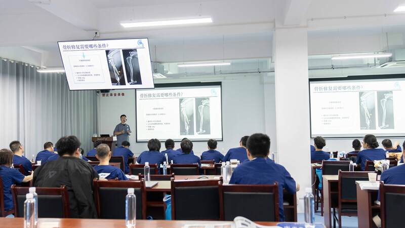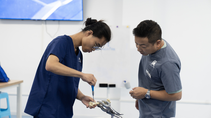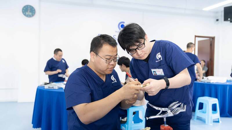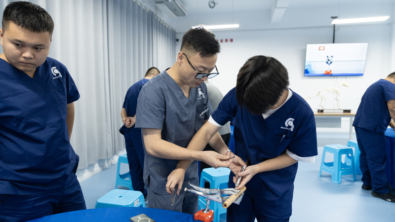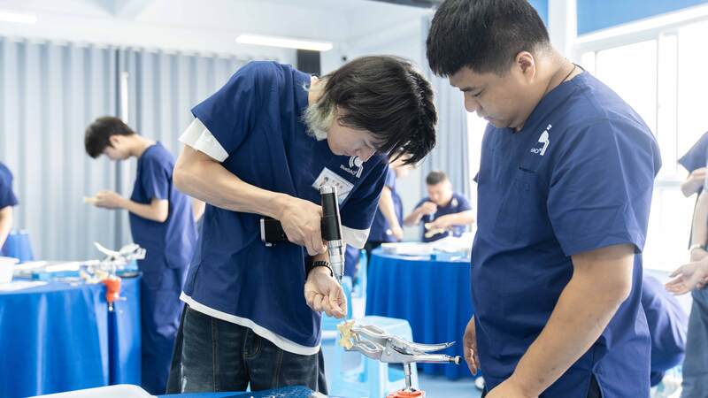 理论课程结束后,干式实操环节即刻启动!李永岐与陶天亮两位老师率先进行操作演示,步骤清晰、要点突出。演示结束后,各小组迅速进入实操练习,在拉力螺钉技术实操环节中,贾新生、李永岐、邵志伟、陶天亮四位指导老师全程跟进,细致巡视每一组操作。