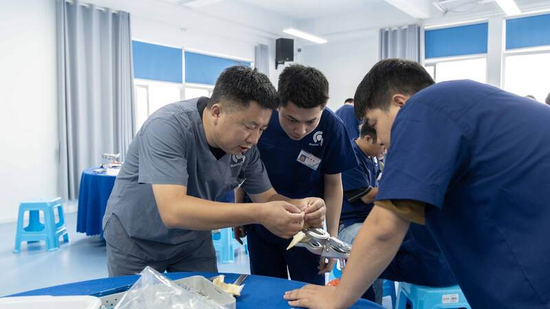在李永岐老师深入浅出地讲解了股骨远端骨折的理论后,课程随即进入了关键的干式实操环节。贾新生、李永岐、邵志伟、陶天亮四位指导老师倾囊相授,通过细致的现场演示和手把手教学,并随时答疑解惑,确保每位医生都能将理论化为扎实的技能。