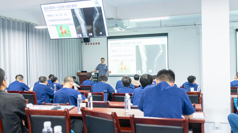 中场休息后,课程继续由贾老师为大家讲解“骨板在骨折中的应用”课程。由浅入深进从简单骨折案例切入,逐步剖析复杂难题;并针对不同骨骼部位与骨折类型,系统讲解了骨板选择与应用的核心要领。通过生动的语言与详实的临床案例,贾老师成功带领在场兽医们深入领会佰陆骨板技术的核心要义与应用精髓。