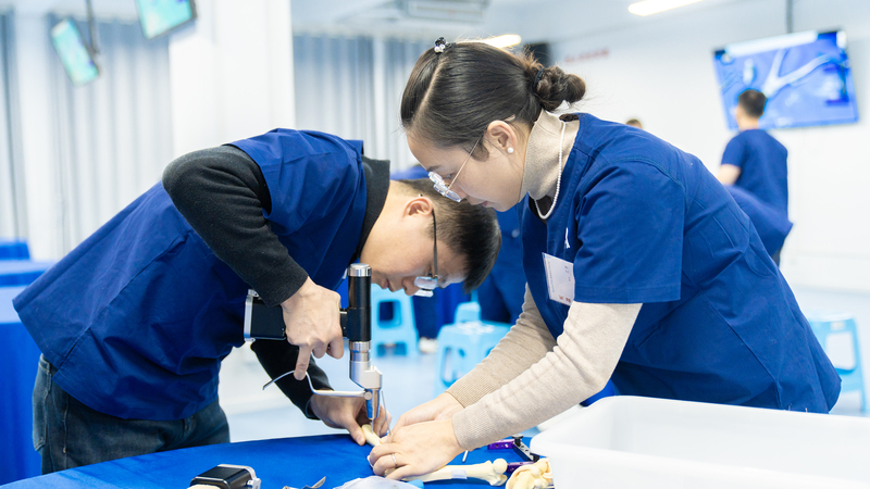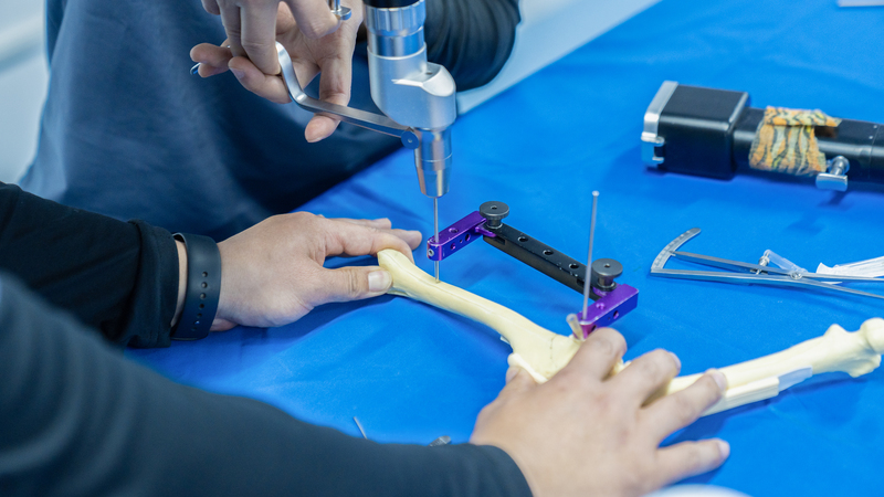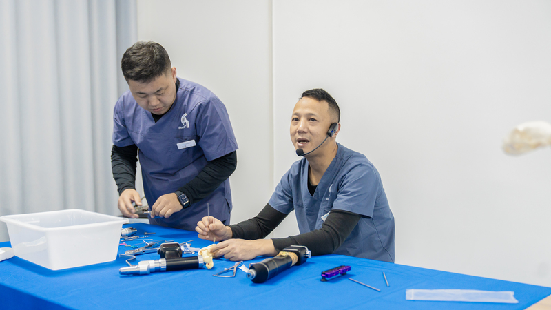 理论实操两手抓!杜浪老师以“理论讲解+ 实操演示”教学模式,系统拆解TPLO手术工具与操作步骤。高仿真膝关节骨模型加持。佰陆讲师团队:周珞平、杜浪、孙康三位老师贯穿全程,进行一对一辅导与即时反馈,确保每位医生精准掌握手术细节,实现从知识到技能的无缝衔接。