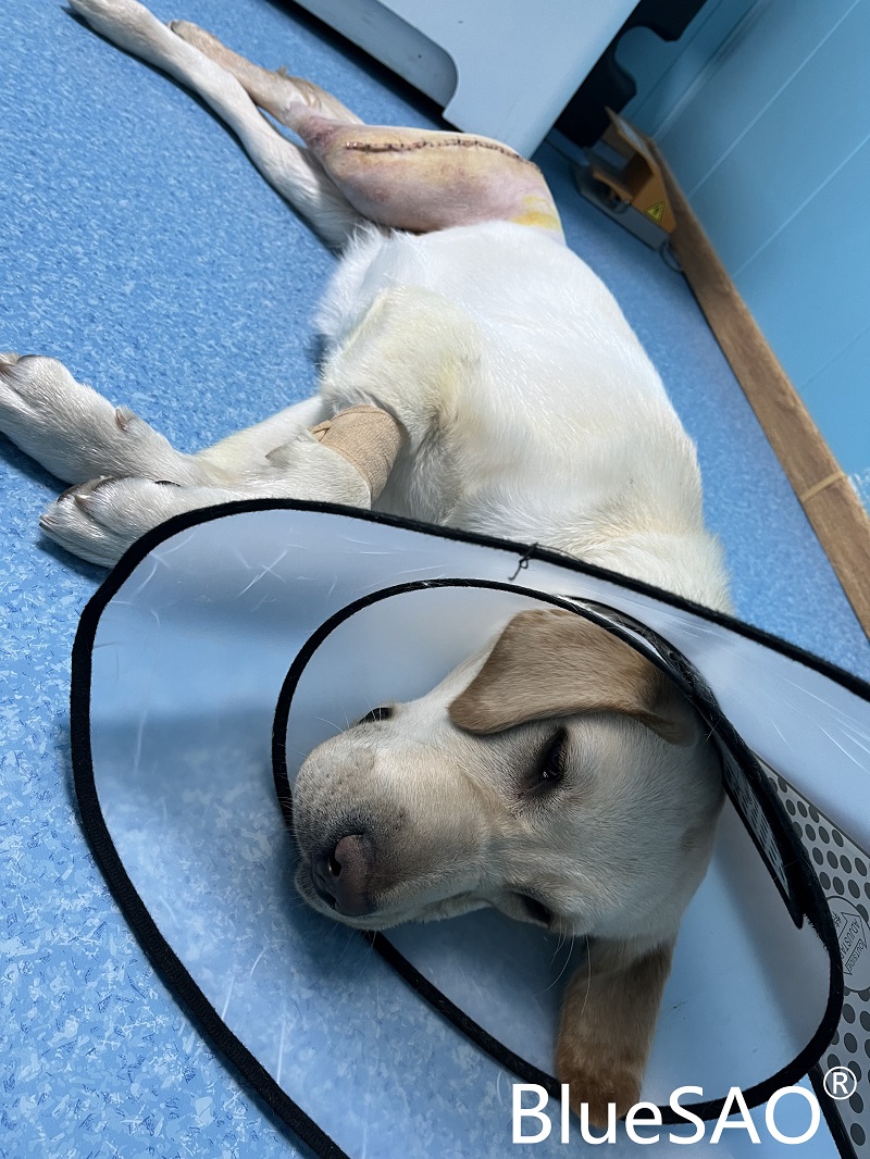 拉布拉多犬,昵称:蛋糕,1岁,公,体重20Kg,因车祸导致股骨远端骨折,术中采用BlueSAO佰陆PRCL®-L系统11mm纯钛锁定骨板进行双板内固定。手术很成功,望尽快康复!